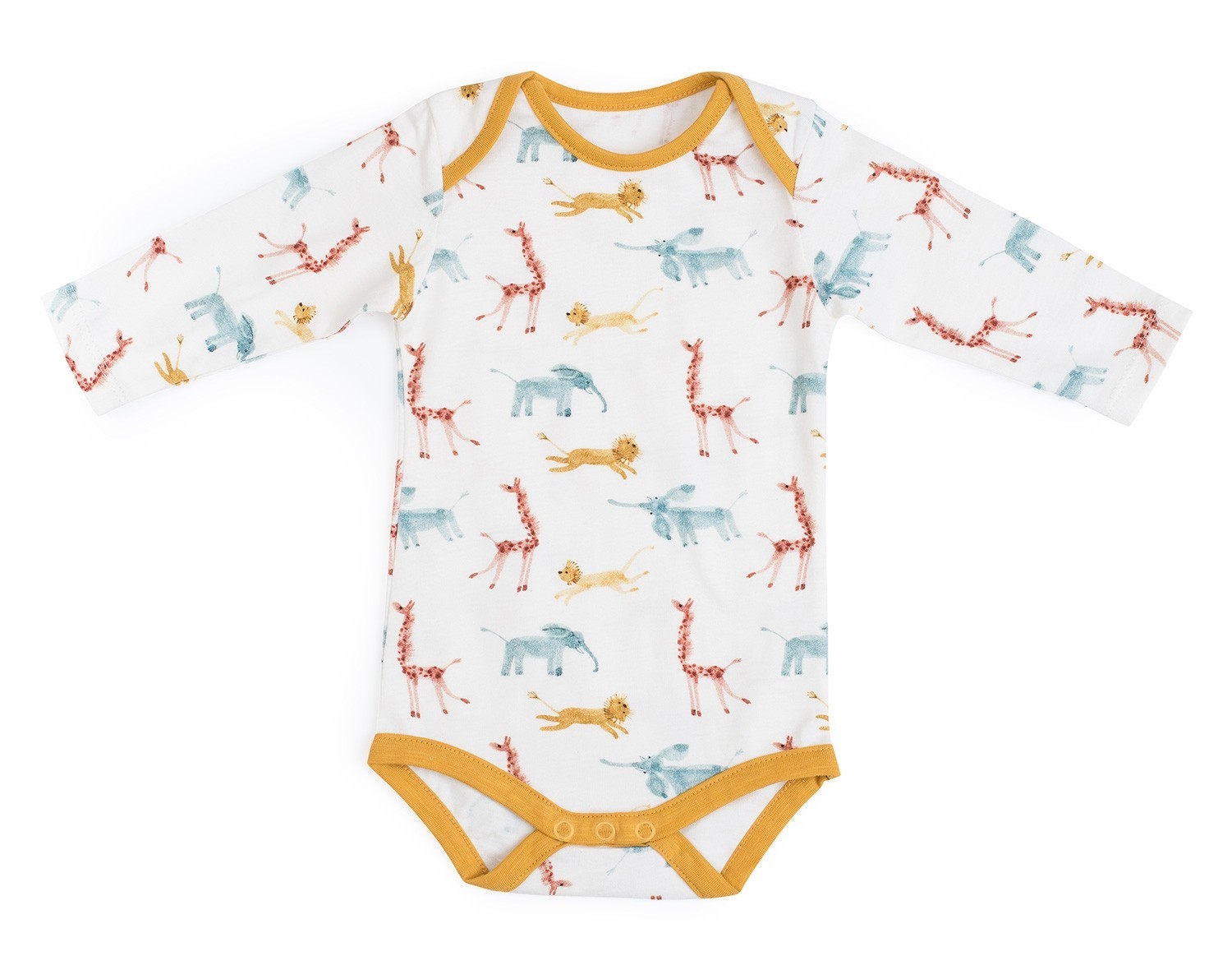 Body crème en jersey de coton pour laisser respirer la peau de bébé pendant les douces nuit d'été. Tissu imprimé de nos trois amis qui gambadent dans la savane, et encolure jaune ocre. - Détail du produit