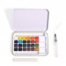 Boîte en métal avec 24 godets aquarelles aux couleurs intenses, un pinceau avec réservoir d'eau et une éponge. La boîte servira également de palette pour créer des mélanges de couleurs. Le kit idéal pour les artistes fans de nature ! - Détail du produit