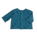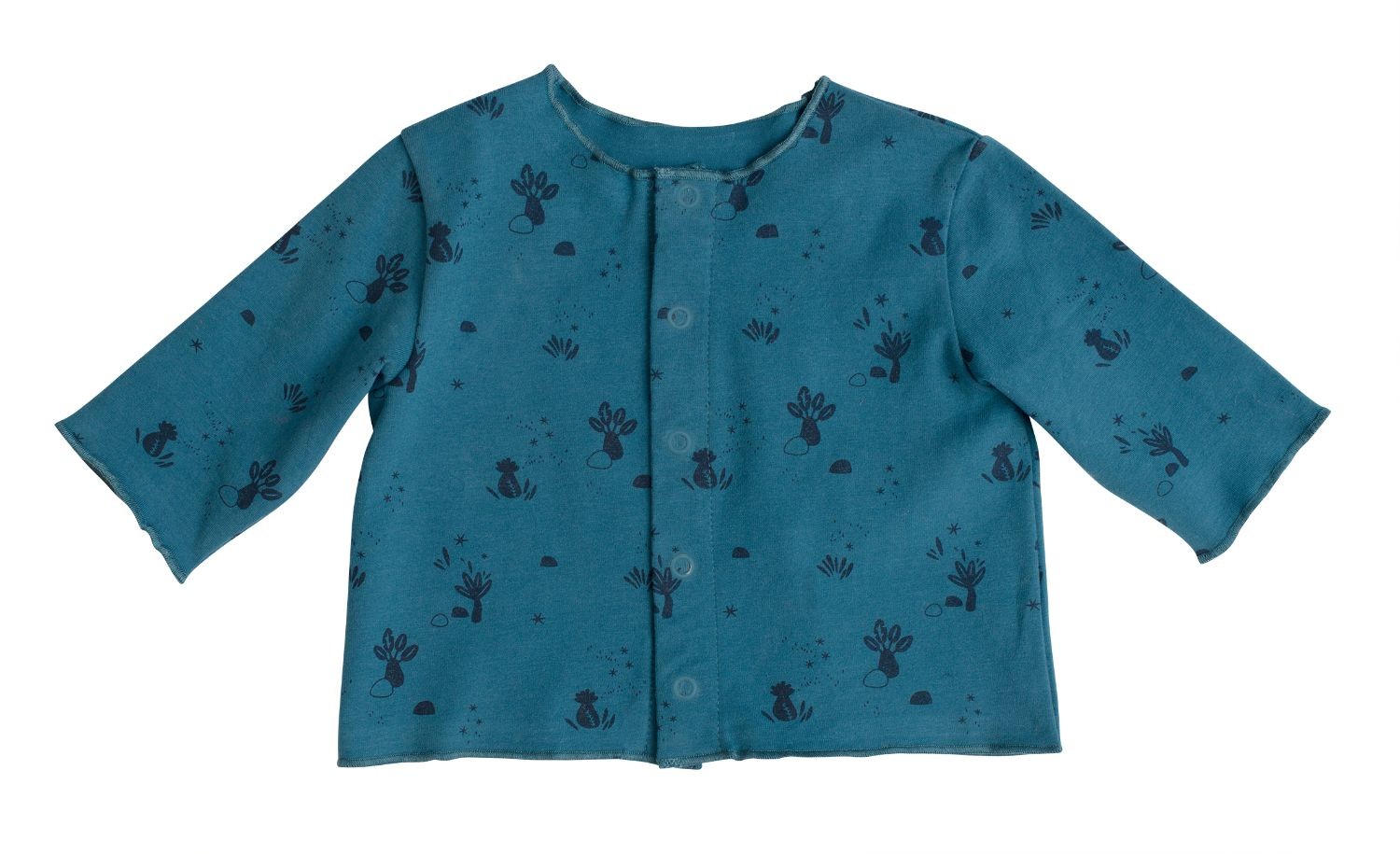 Cardigan bleu en coton et élasthanne pour une bonne tenue, imprimé de motifs de la savane. Manches longues, boutons-pression à l'avant, et finitions au point de bourdon. - Détail du produit