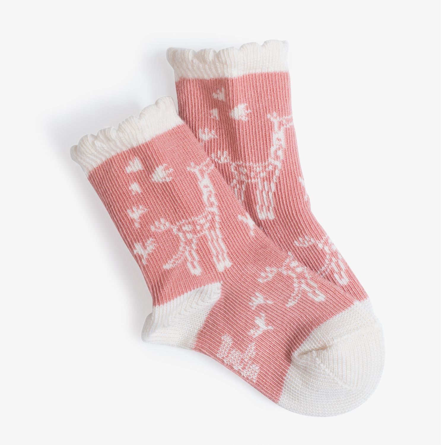 Socquettes crème et rose Bibiscus la girafe, et ses petites dentelles à la cheville. 100% françaises. - Détail du produit