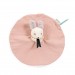 Doudou Brume avec sa robe en lange rose poudré, surmontée d'une collerette à fleurs. Son adorable minois brodé et ses grandes oreilles en fourrure se glisseront auprès de bébé pour ses moments de rêverie. Il peut être brodé au prénom de l'enfant. - Détail du produit