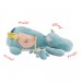 Gros hippopotame d'activités, tout rond, en velours bleu et fourrure mousseuse, posture tranquille, à plat ventre, prêt à jouer avec bébé. Il cache sur son dos dans une poche, des feuilles avec du papier crissant et son tout petit hippopotame hochet. - Détail du produit