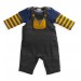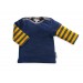 Tee-shirt coupe droite en jersey flammé bleu nuit avec jeu dempiècements donnant un effet de superposition manches courtes sur manches longues en jersey rayé ocre et gris. Bouton pressions à lencolure.