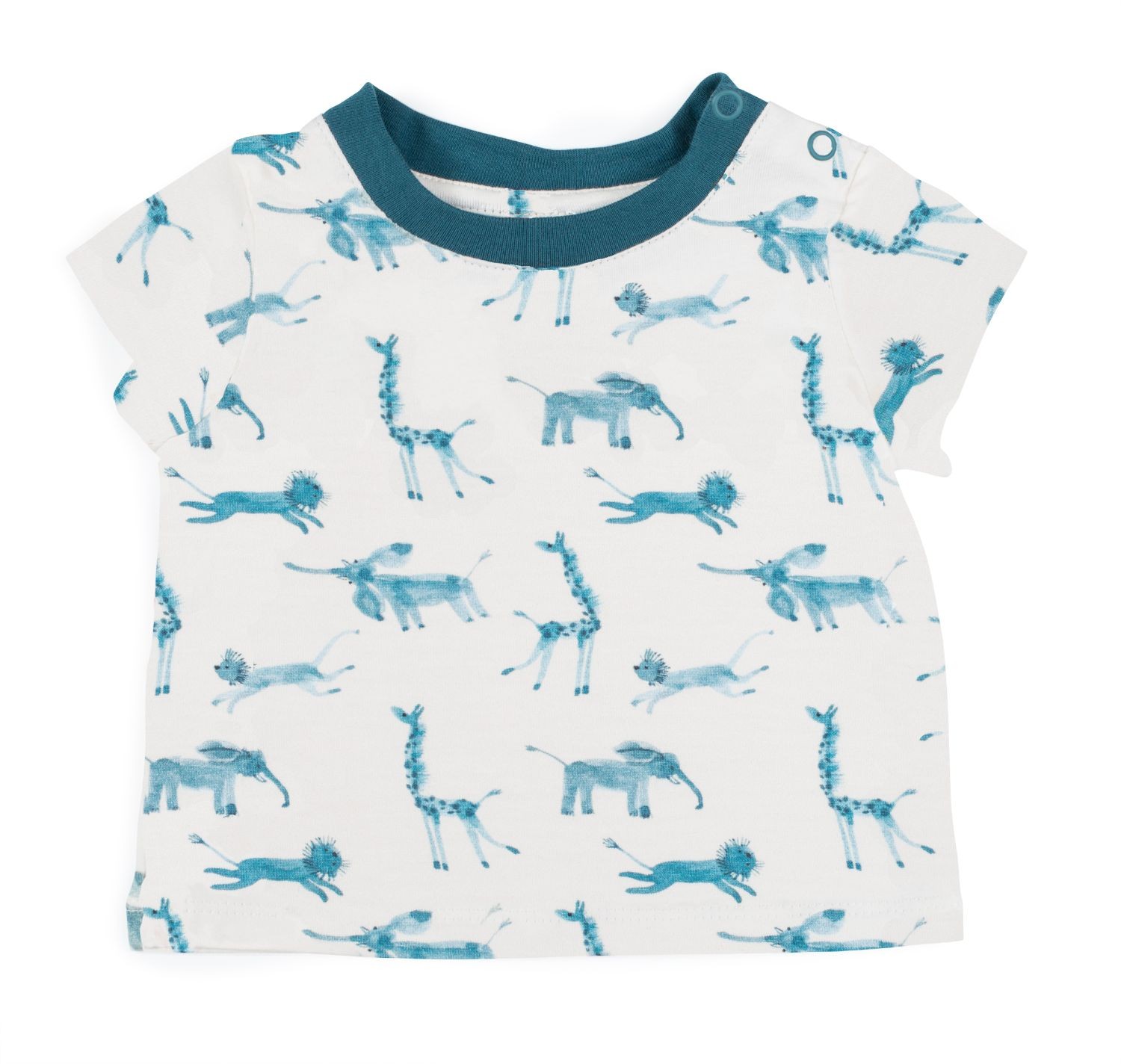 T-shirt crème à motifs d'animaux, souple et agréable à porter. Bord-côte gris-bleu aux couleurs du dessin, et boutons-pression à l'épaule pour l'habillage. - Détail du produit
