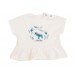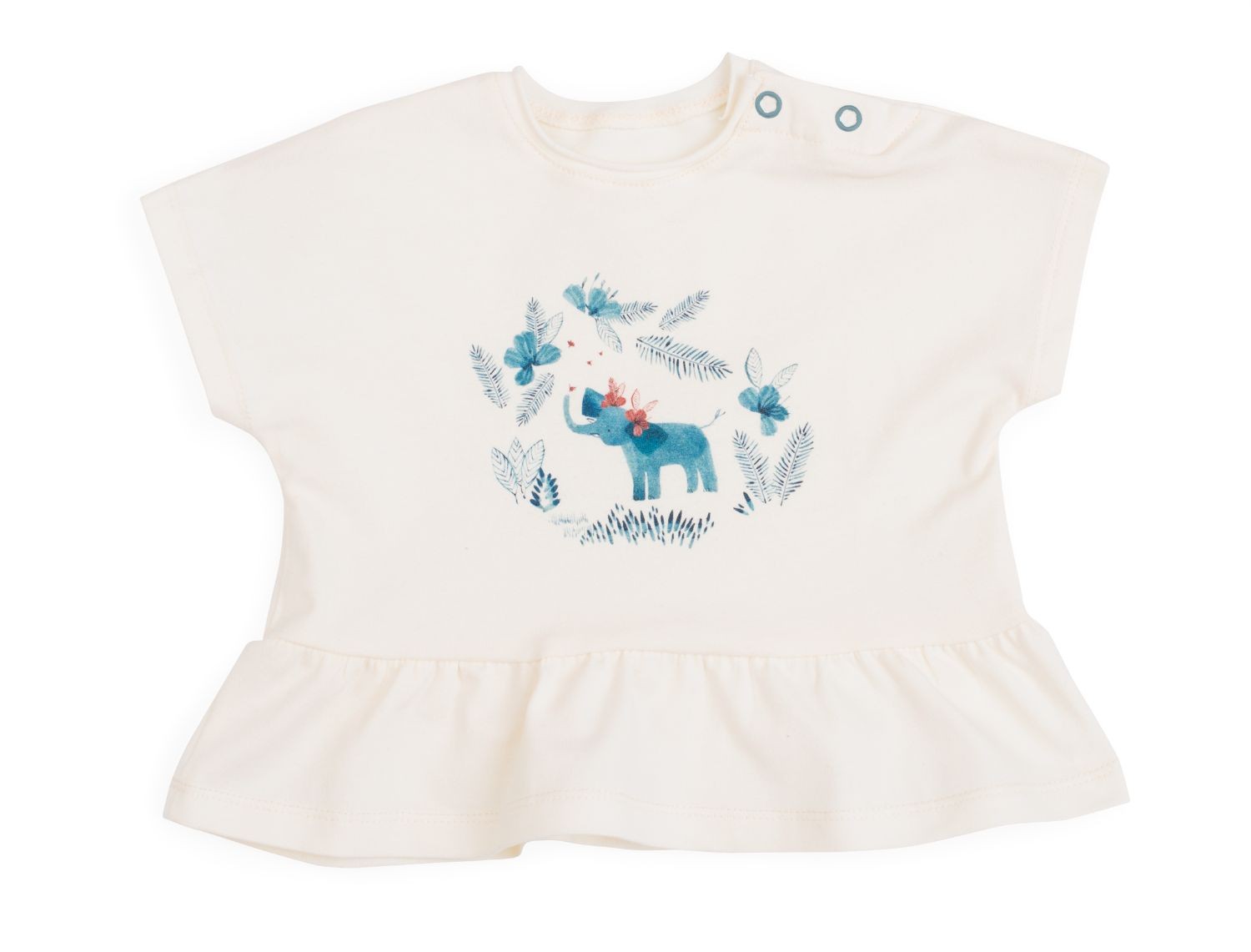 T-shirt crème avec Bergamote l'éléphant, esquissé finement à l'aquarelle. Bas à fronces pour un effet volant, et petits boutons-pression sur l'épaule. - Détail du produit